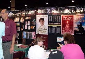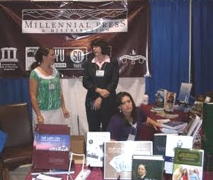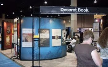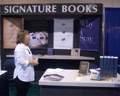 This is one display of new Cedar Fort books. I think most of these have already been released. They had another bank of books this size that held new releases, as well. Some of them looked interesting. I would have been tempted to swipe a few but 1) they didn’t have any that were just sitting around asking to be swiped, and 2) Lyle Mortimer was sitting right there giving me the evil eyeball. (Not really “evil”—just suspicious. I think it was the peacock feathers. I was molting all over his booth.)